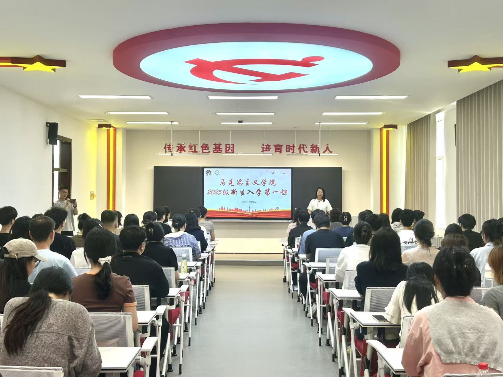 2025级硕士研究生开学第一课活动在智慧教室I举办。全体新生参加活动,学院院长于浚湜以“青春心向党 薪火永相传”为题讲授了开学第一课。