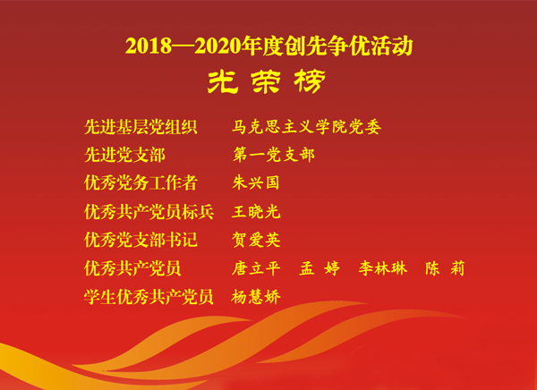 党委荣获“先进基层党组织”称号;学院党委书记朱兴国被评为优秀党务工作者;第一党支部被评为先进党支部,贺爱英被评为优秀党支部书记;副院长王晓光被评为优秀共产党员标兵,唐立平、孟婷、李林琳、陈莉被评为优秀共产党员,杨慧娇被评为学生优秀共产党员。