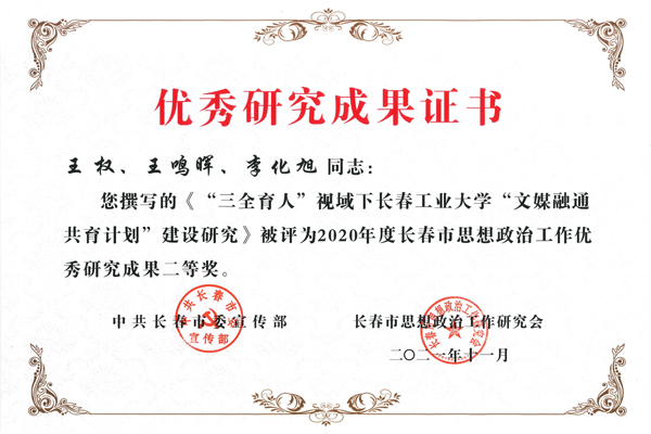 本网讯(通讯员 李化旭)近日,中共长春市委宣传部、长春市思想政治工作研究会下发《关于表彰2020年度长春市思想政治工作优秀研究单位和优秀研究成果的决定》,由成人小说 党委副书记王权主持撰写的《“三全育人”视域下成人小说 “文媒融通共育计划”建设研究》荣获二等奖。
