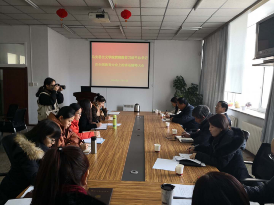 在学院资料室召开学习贯彻落实习近平总书记在全国教育大会上的讲话精神大会,学校党委书记万春明、教务处处长李万龙参加会议,会议由学院党总支书记朱兴国主持。