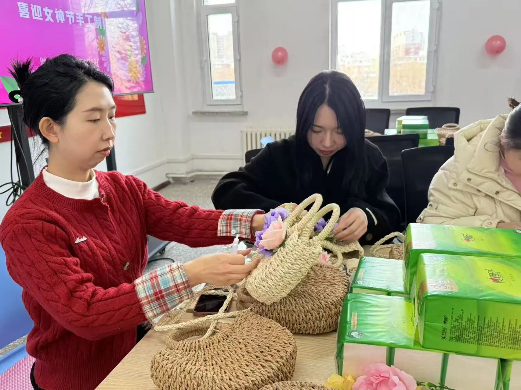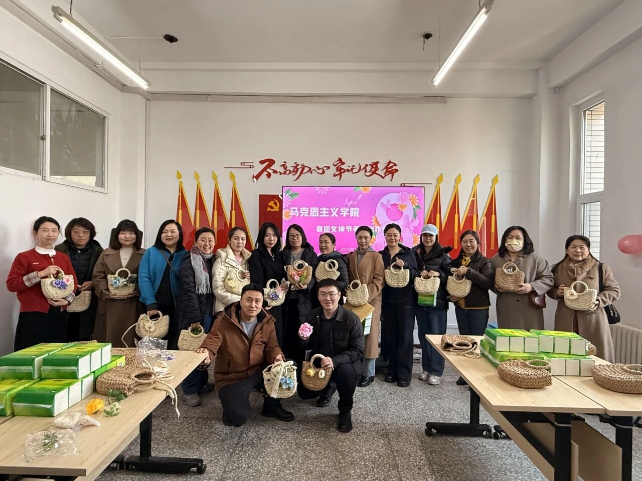 在学院会议室开展“包揽春日,魅力巾帼”手工草编包DIY活动,全院女性教职工齐聚一堂,共度温馨且意义非凡的节日。