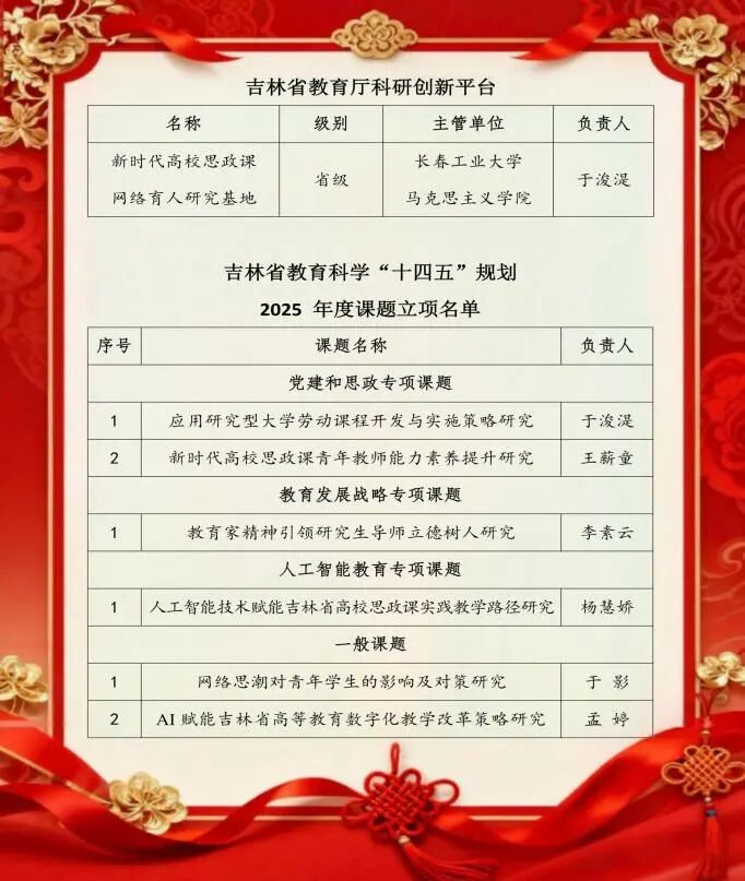 近日,成人小说 申报的“新时代高校思政课网络育人研究基地”,成功获批吉林省人文社科研究基地。吉林省教育科学研究领导小组办公室发布了“吉林省教育科学‘十四五规划’2025年度课题”立项名单,成人小说 共有6项课题获得立项批准,其中党建和思政专项课题2项、教育发展战略专项课题1项、人工智能教育专项课题1项,一般课题2项。